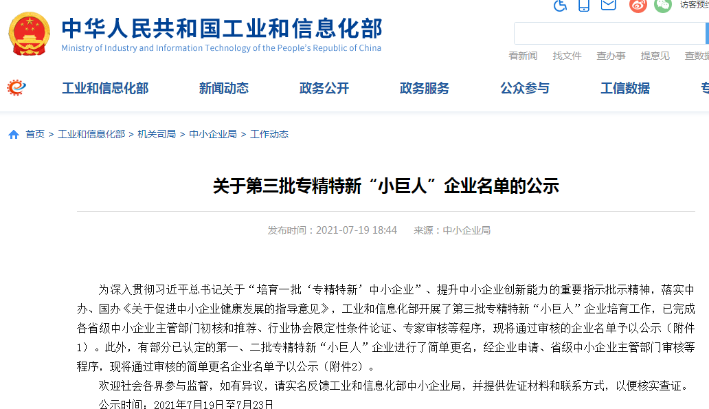 專(zhuān)精特新企業(yè)是指具有“專(zhuān)業(yè)化、精細(xì)化、特色化、新穎化”特征的中小企業(yè),而國(guó)家級(jí)專(zhuān)精特新“小巨人”是專(zhuān)精特新企業(yè)的最高榮譽(yù)稱(chēng)號(hào),從省級(jí)專(zhuān)精特新“小巨人”企業(yè)中篩選,經(jīng)國(guó)家工信部審核確認(rèn)后發(fā)布。